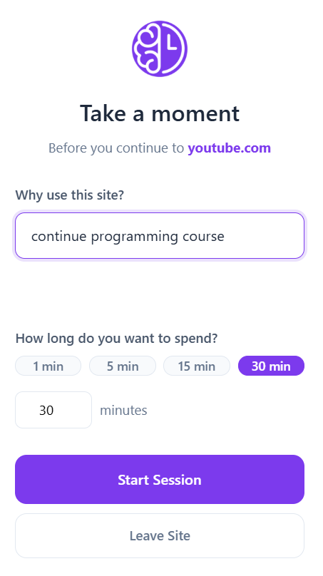 Every time you visit a distracting site, ClearMind pauses and asks: 'Why are you here? How long will you stay?'